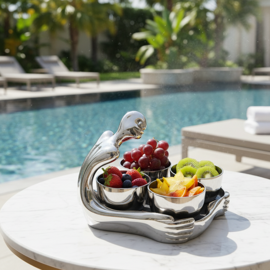 A set of 4 serving bowls crafted from aluminium and held in place by a sculptural figurative form designed by Carrol. 4 Bowl Server - maitre d' is a 4 piece condiment or appetiser set waiting to help you serve.