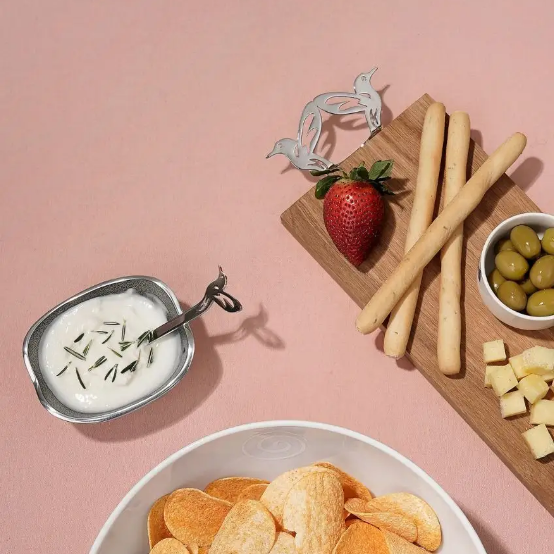 An elongated serving board with a beautiful open grain textured American oak surface, complemented by a pair of awe-inspiring hummingbirds which serve as sturdy handles at each end. Invite the beauty of nature into your home with this stately addition to the Hummingbird range, which is inspired by a graceful and seemingly effortless moment in the flight if these magnificent little birds. Its generous size allows you to elegantly arrange your choice selection of artisanal snacks, appetizers or finger foods, leaving your guests all aflutter at your next cocktail party. The intricate, polished handles are laser cut from durable stainless steel polished and the board treated with food safe oil, so you can look forward to enjoying many memories with this functional art piece. Purchase the gherkin fork, butter spreader, serviette holder, and other products from our Hummingbird range and leave everyone tweeting about these fledglings at your next event.