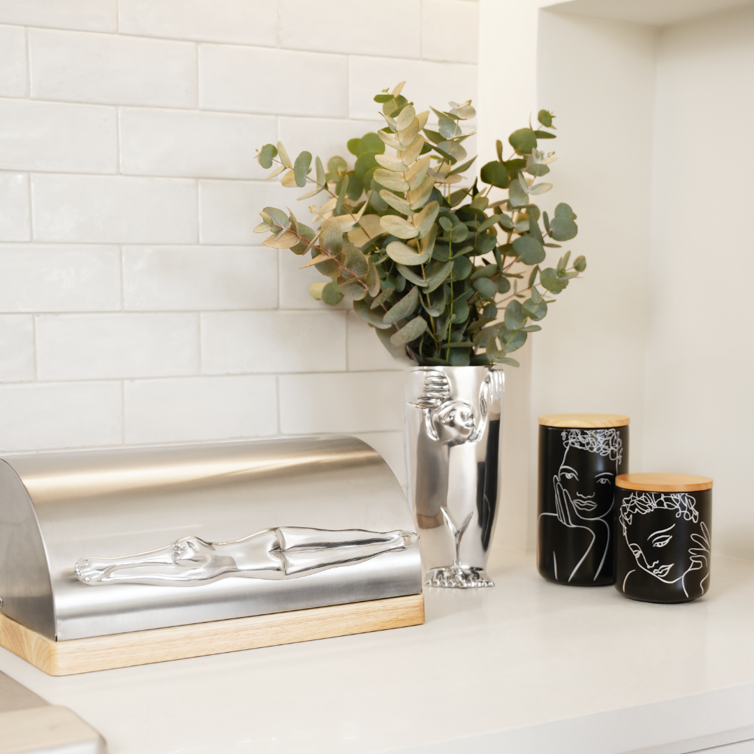 A second addition to the best-selling Bread Bin range is now joined by new Iconic arrival 'diver' Bread Bin. Our kitchen storage range welcomes our second striking sculptural stainless steel Bread Bin designed to be a highlight on any kitchen counter. This luxury storage bin is ideal for keeping bread, rolls and baked treats out of sight and freshly stored. Carrol's 'diver' design is a classic portrayal of the human form in a diving pose. The detailed aluminium sculpture figure doubles as the unique handle to open and close the stainless steel bin. The base of the bin is made from rubberwood and the bin has air holes at the back to keep airflow circulating to avoid yeasty smells and mould build up. A designer Bread Bin made to attract attention and create conversation within the heart of the home. Unmistakably Carrol Boyes expertly crafted and locally manufactured. A heirloom piece to be proud of. Dimensions: L: 390mm x W: 307mm x H: 185mm