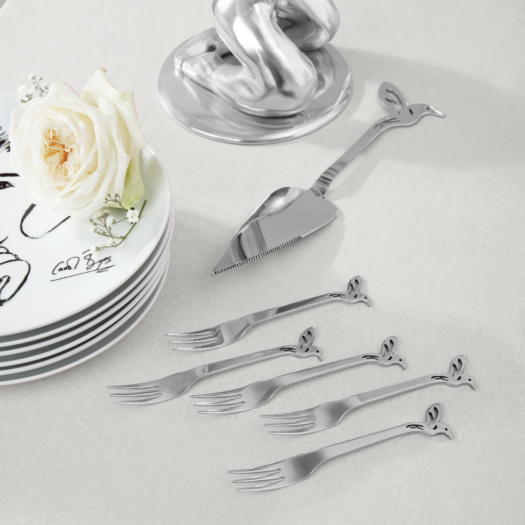 A Set of 6 Hummingbird Cake Forks designed for afternoon teas, picnics, and everything in between. Crafted from stainless-steel and mirror polished for elevated dining experiences.