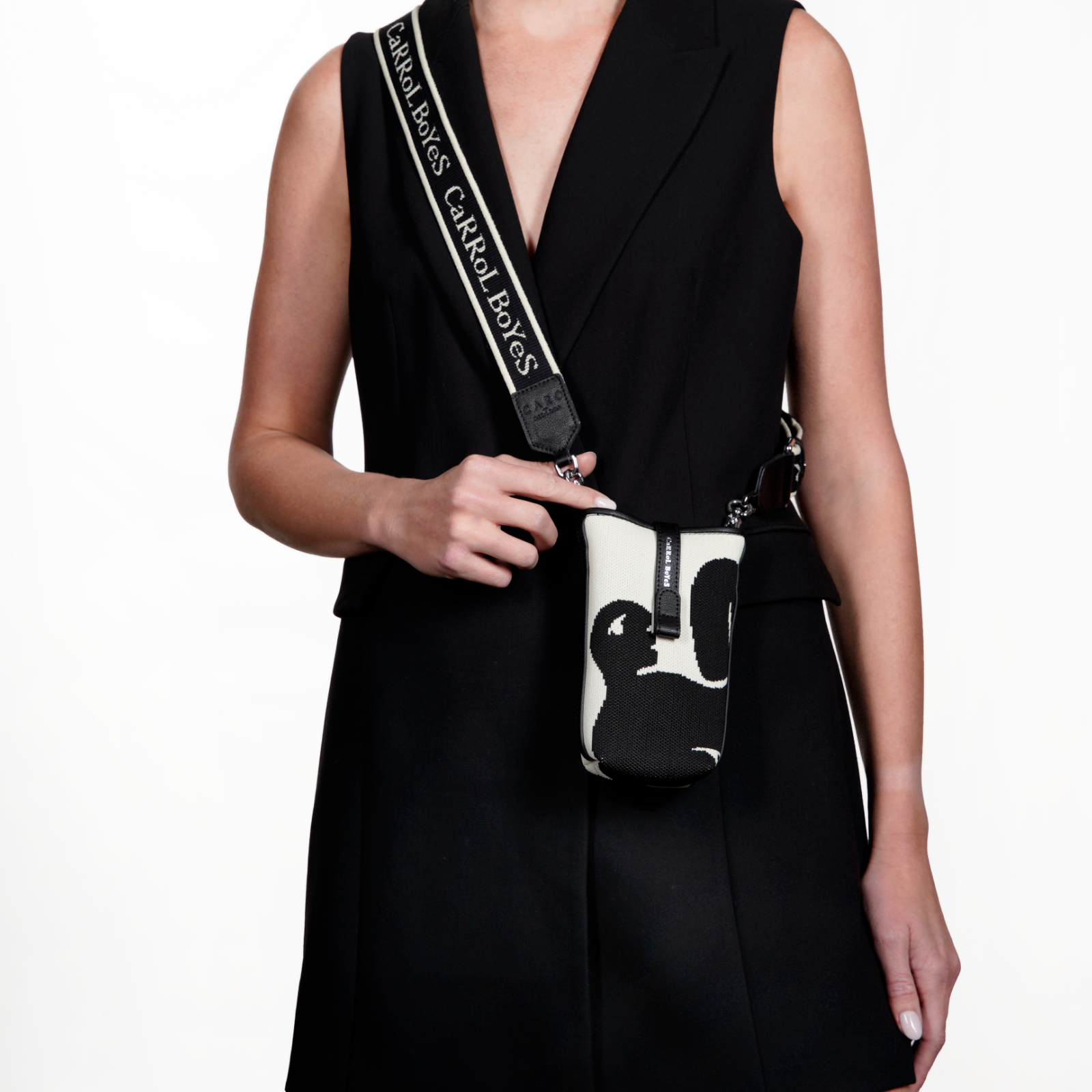 The leather Crossbody Phone Pouch - pulse black merges art with durability to help ensure your phone is kept safe and easily accessible. It features a black iconic figure against a white background and has an elegant leather tab for extra safety, with a comfortable, adjustable, detachable strap. Dimensions: L10cm W5cm H18cm.