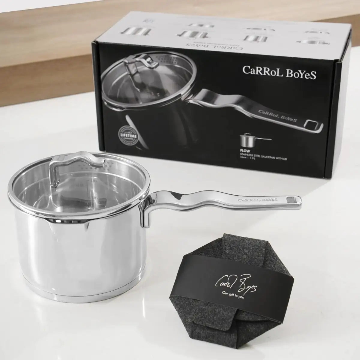 A signature Saucepan from the Flow Cookware Range. A premium 16cm saucepan perfect for creating the base of many dishes such as stocks, broths or the creation or reduction of sauces. The expertly crafted size design of this kitchen staple features a pouring lip for chocolate ganache and custard. The relative shallowness this saucepan also lends itself to the thickening of sauces and gravy. This versatile piece is also useful for the preparation of grains, including rice and oats, poaching eggs or boiling vegetables. Inspired by the natural flow and motion of fingers wrapping around a handle, the Flow cookware range caters for those with a taste for quality cookware. Carrol's handle design is echoed throughout the range in the handle of each pot, pan and lid. Collect the entire 7-piece set for a choice cookware range that is a beautiful as it is functional. Imperial and metric measurements are laser engraved on the inner wall of this pot for the ease of following recipes. Superior heat distribution and retention performance is achieved by the 6,5mm thick impact bonded base while the 1mm thickened wall provides improved durability. Dishwasher safe.