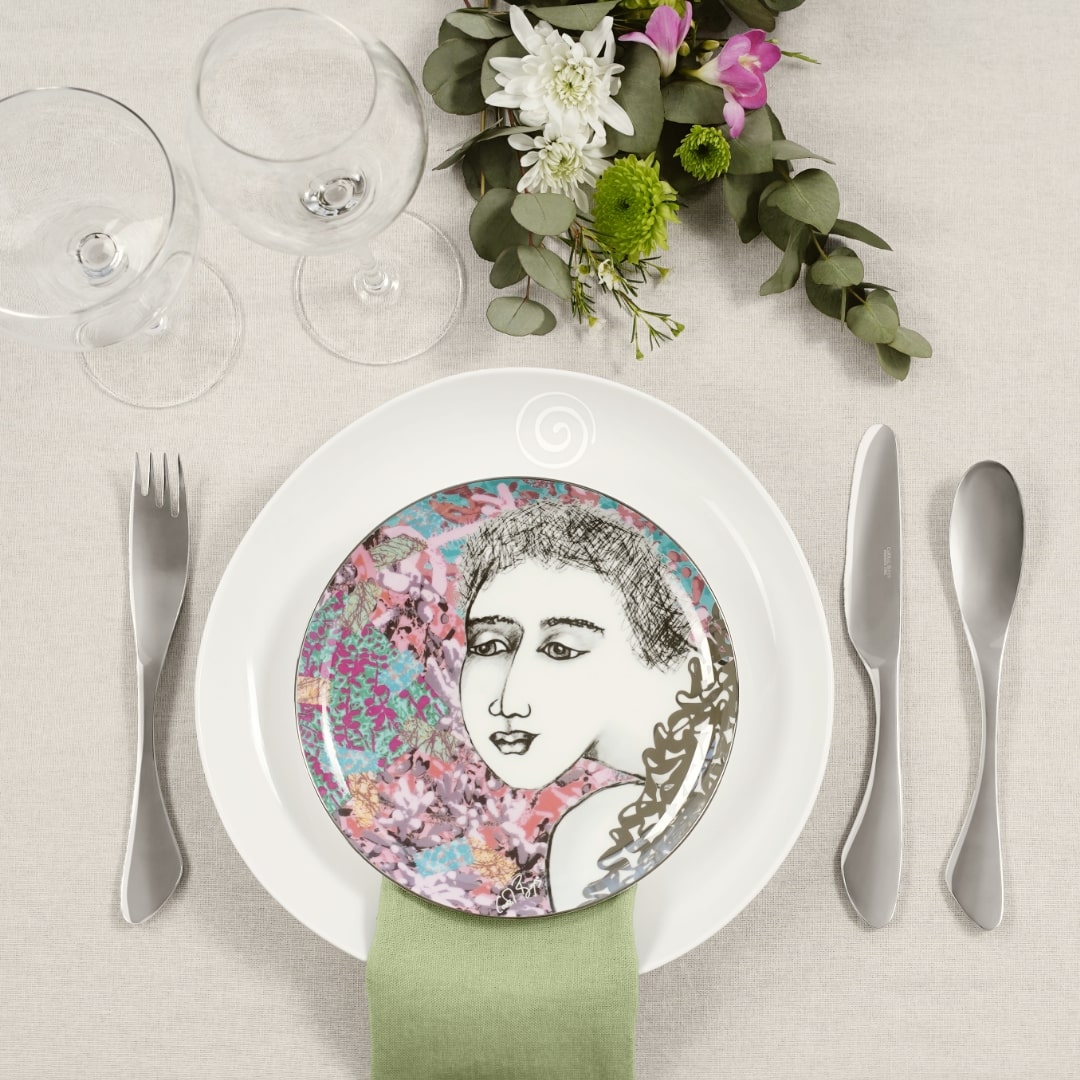 The Kaleidoscope Range’s 'luscious' Side Plate Set of 2 is crafted from Fine Bone China. Each depicts a different woman with classic sketchbook features. They rest on a floral-inspired background and are wreathed by artistic metallic platinum embellishments. Enjoy using them at meals and serving snacks at tea times. Handwash.
