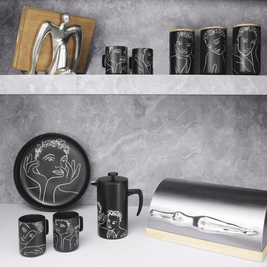 Going above and beyond, a lithe aluminium sculptural figure comfortably holds three American Oak boards for your convenience.