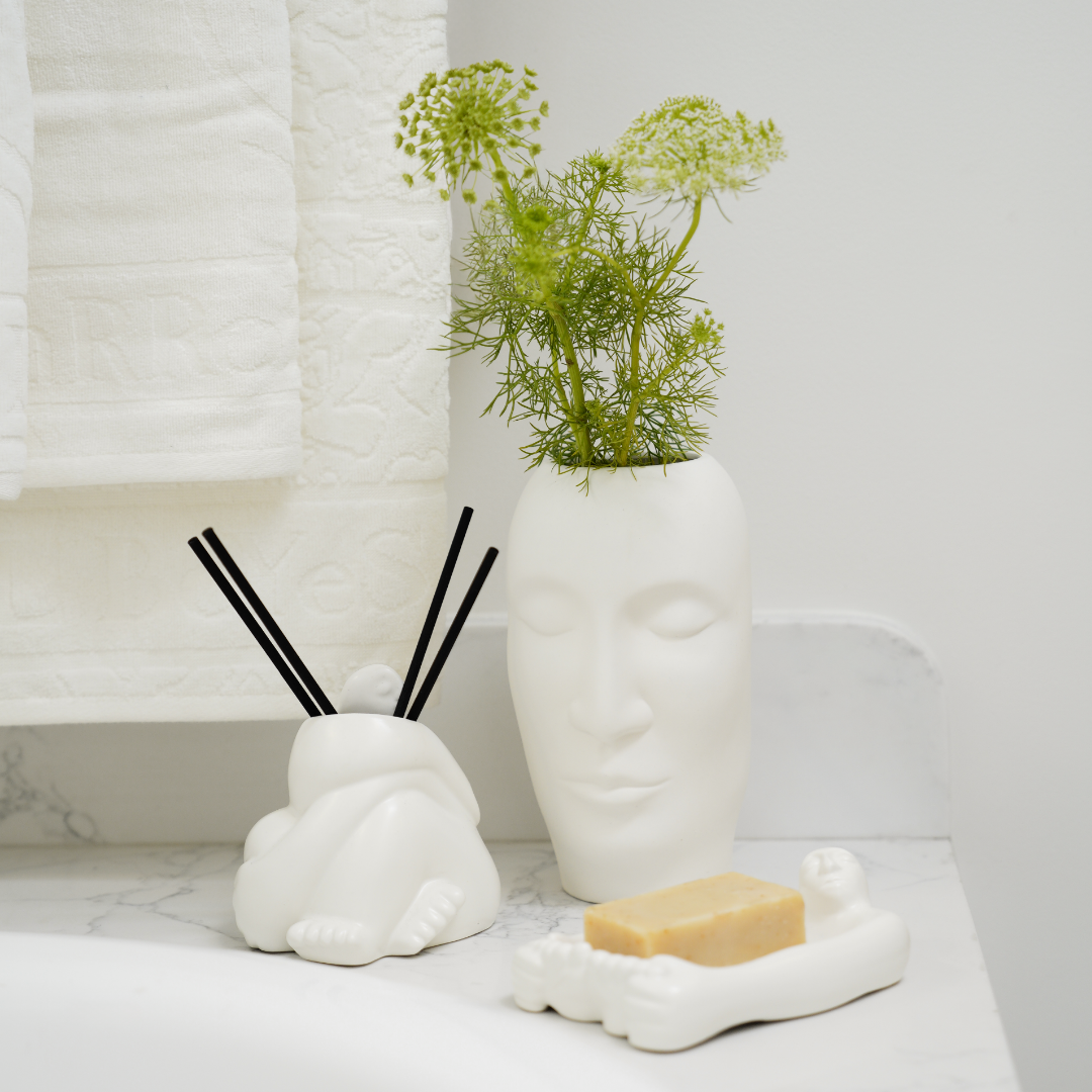 This mysterious sculptural Vase from the Enigma range is a welcome addition to our home and décor range. Crafted from porcelain with a smooth satin glaze this Vase can be used as a striking centrepoint on any dining table or mantle piece. Carrol's Enigma range has a distinctive intense focus on facial features and is inspired by sculptural work done by Renaissance artist Michelangelo. This vase can be paired with the Large Bowl as a decor installation or with the Salt and Pepper Set and Mug Set in the same range for a sophisticated dining display. Paired with the enigmatic bathroom range, this vase lends itself to versatility both in the bathroom, living, dining and kitchen spaces in your home. Explore the entire Enigma collection for a styled look that is serene yet mysterious. Wash in warm water - dishwasher safe.