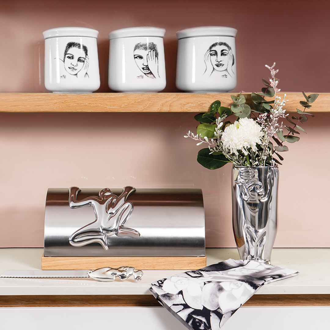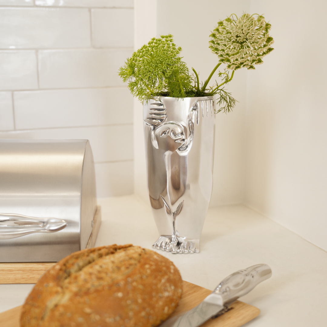 Adorn your bedside table or mantle with this stylish vase, inspired by sumo wrestling. Medium-sized, it is made from aluminium and has a mirror-polish finish. A fitting addition to a myriad of spaces.